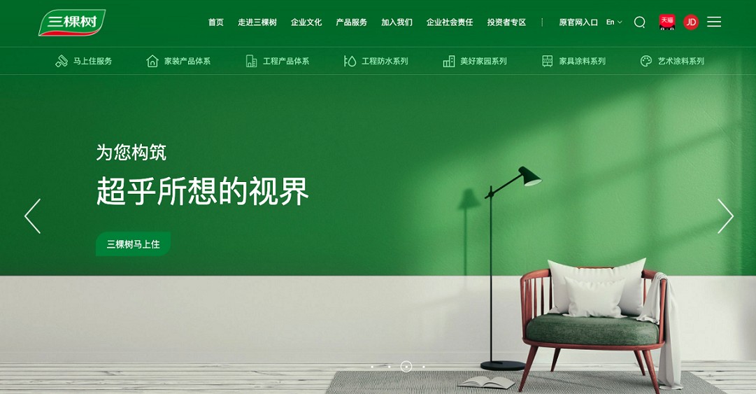 三棵树创立于2002年,致力于打造内外墙涂料、防水、保温、地坪、辅材、施工“六位一体”的绿色建材一站式集成系统,提供以高品质涂料为主、家居新材料为辅的全配套、健康、色彩、品位、一体的美好生活解决方案。